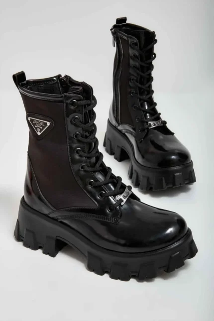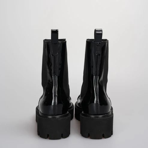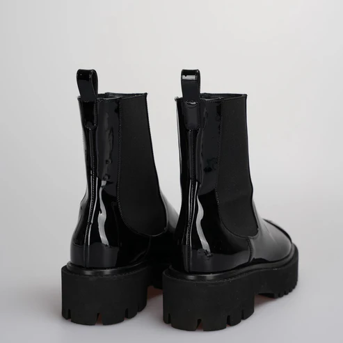 These are Chanel Patent Calfskin Cap-Toe Ankle Boots, commonly referred to as Chanel Chelsea boots. They are a popular style featuring a chunky lug sole and the iconic interlocking CC logo on the toe cap.