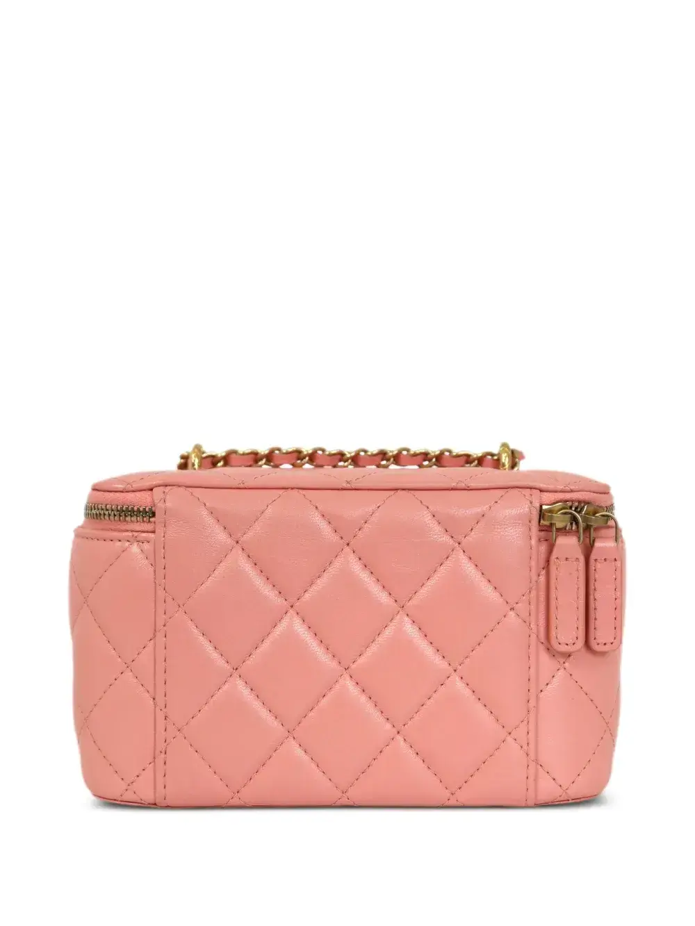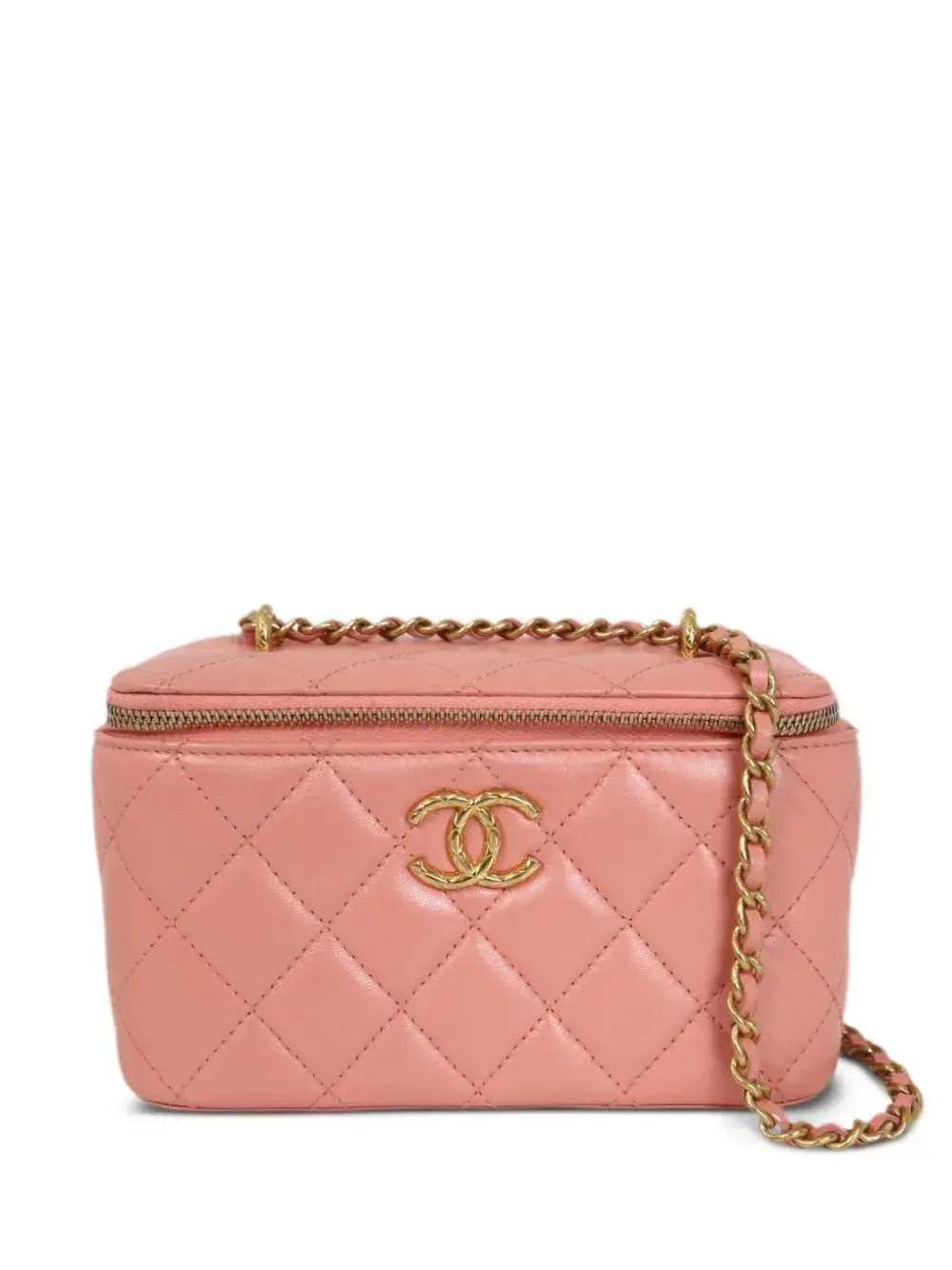 The Chanel Mini Vanity in Pink adds a soft and feminine touch to any ensemble. Its compact, boxy design with a top handle and chain strap combines style and functionality, providing enough space for daily essentials. The delicate pink hue gives a playful yet elegant vibe, perfect for day outings or special occasions.