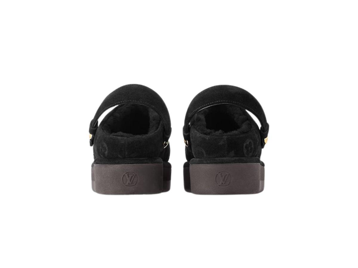 The footwear shown in the image is the Louis Vuitton Aspen Platform Clog (or Sabot Aspen à plateforme in French). This specific version is made from velvety suede calf leather with a Monogram pattern and a snug shearling lining, designed for comfort and style.