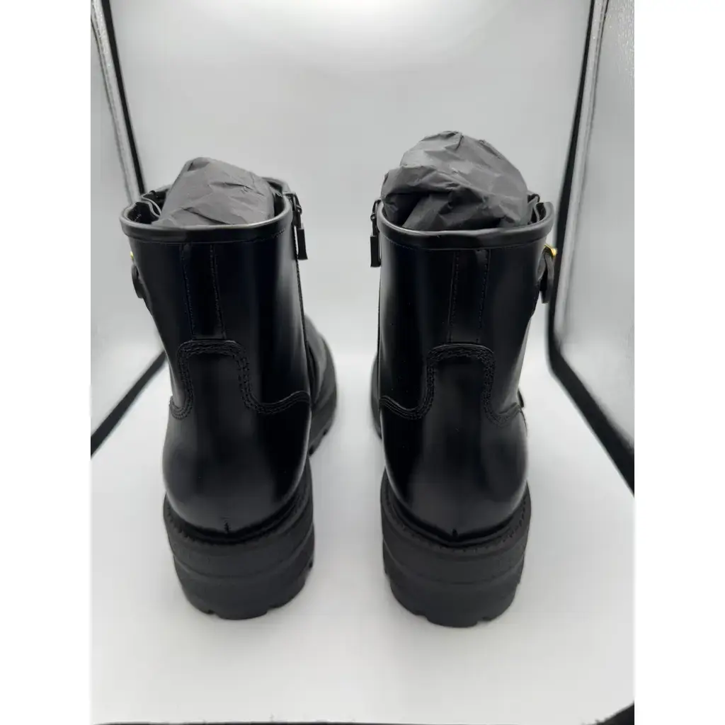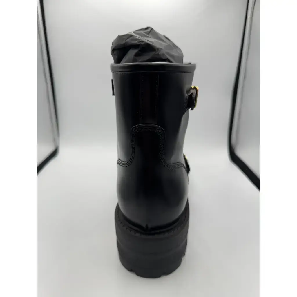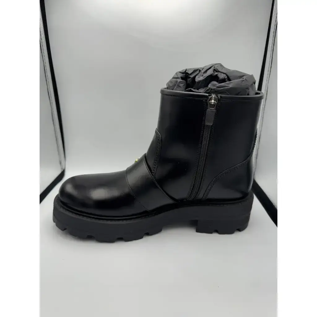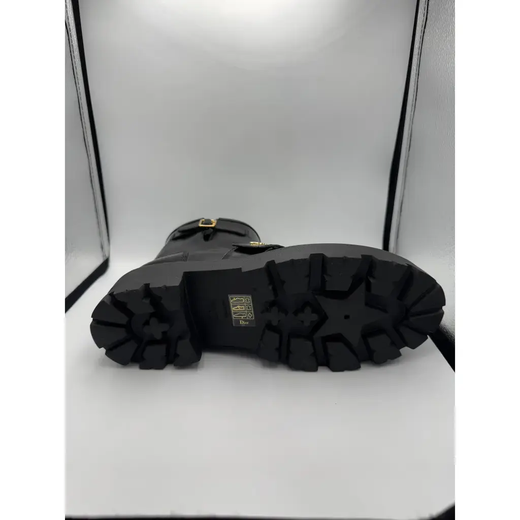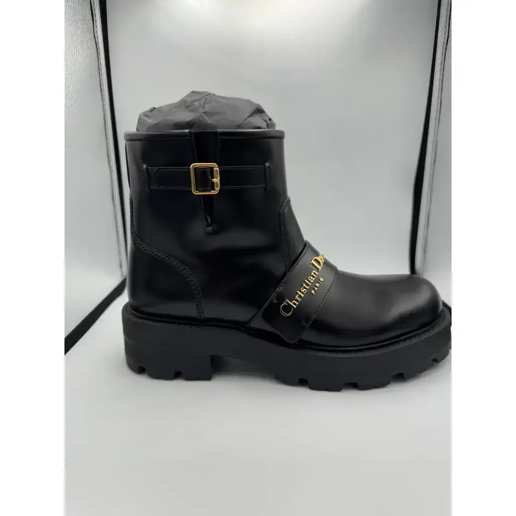 The boots in the image are the D-Quest ankle boots from Christian Dior. They are crafted in black calfskin and feature a distinctive decorative strap with a gold-finish metal “Christian Dior Paris” signature.