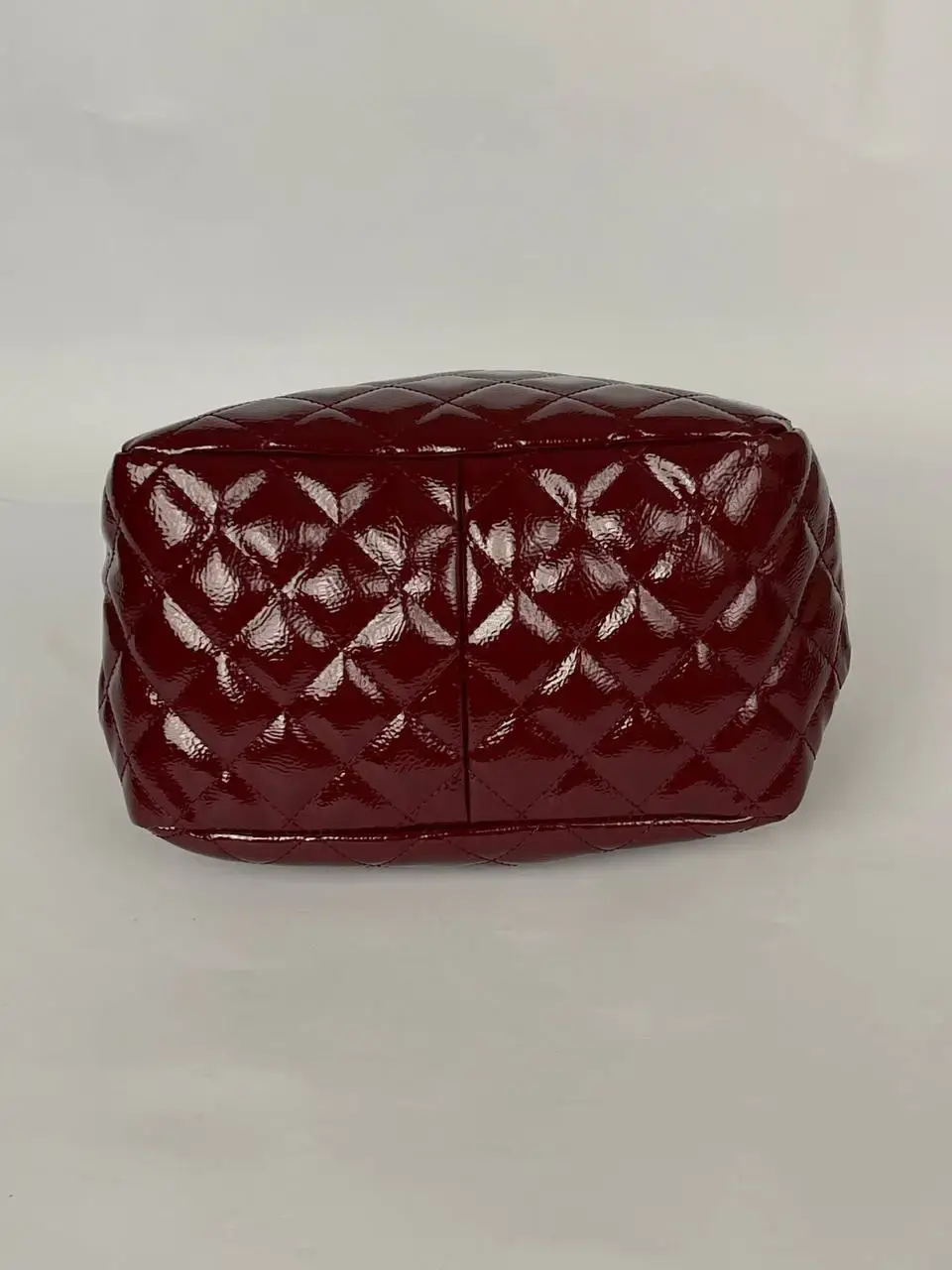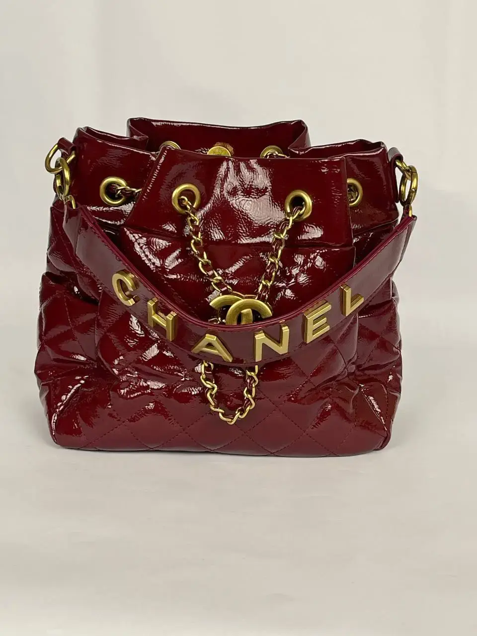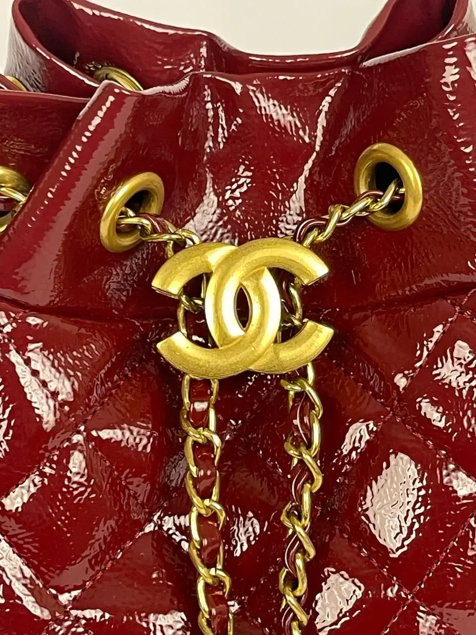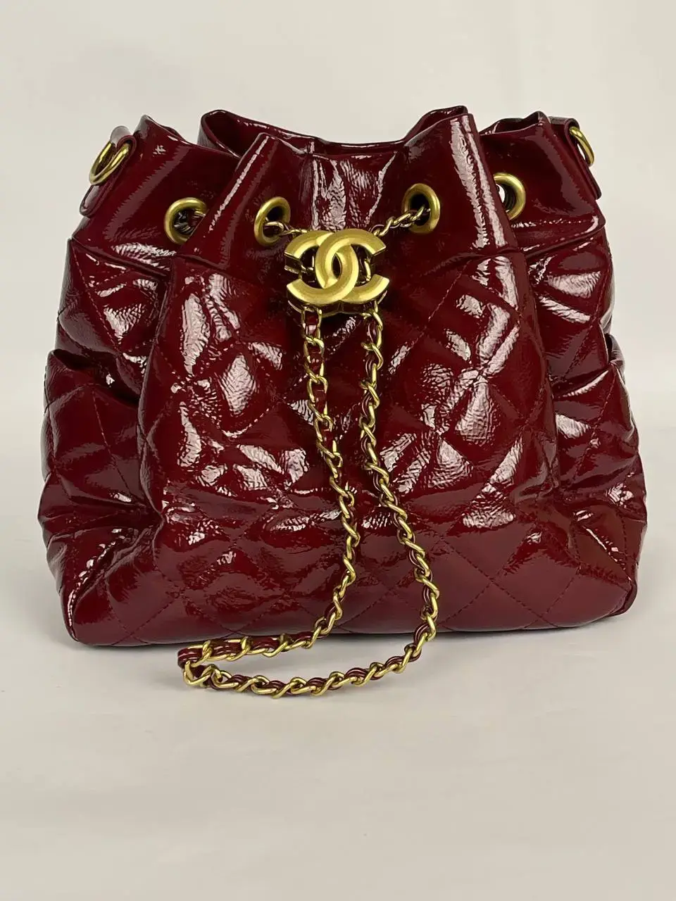 Chanel brand. The bag is designed in a shiny, glossy red patent leather with quilted stitching, giving it a sophisticated and elegant look. It features the iconic Chanel CC logo in gold at the center, adding a touch of luxury. The bag has a drawstring closure, paired with a gold chain strap, which allows it to be worn over the shoulder or across the body. This Chanel Drawstring Bucket Bag combines both style and function, making it a high-end fashion statement.