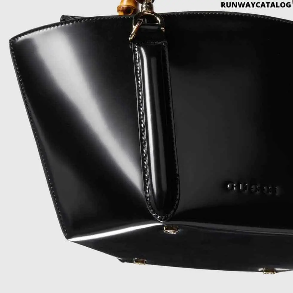 The Gucci Mini Bamboo Top Handle in Black is a luxurious and stylish bag that perfectly combines elegance and practicality. Its basket-inspired design with a hexagonal base gives it a unique and eye-catching look for any outfit.