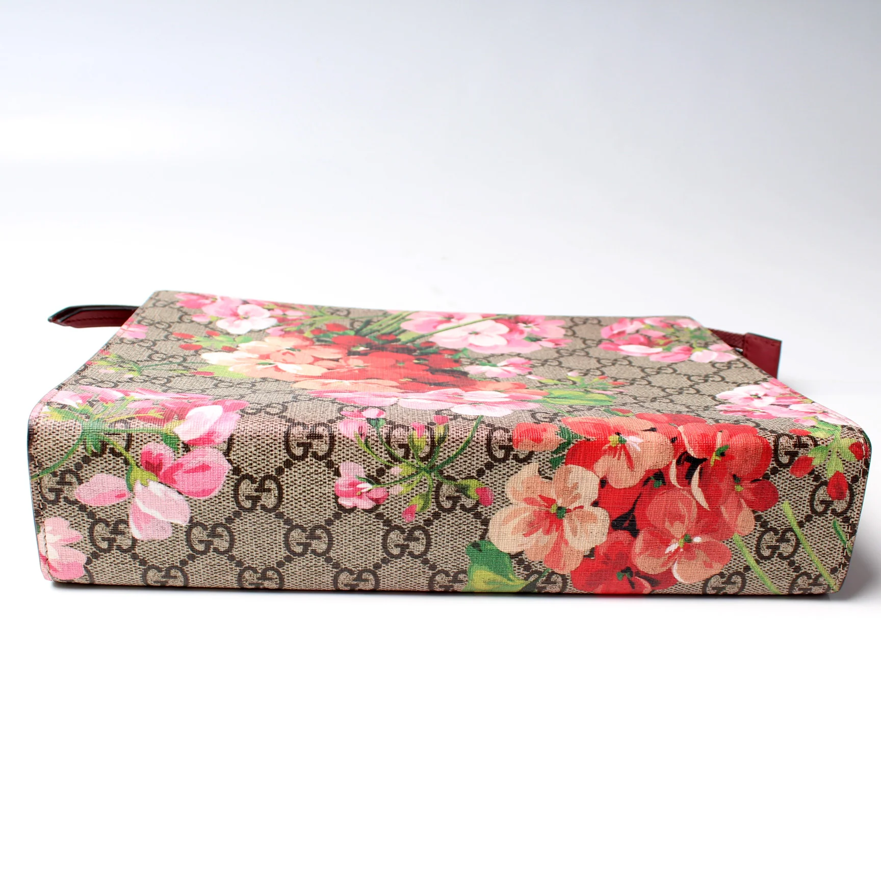 This pre-owned Gucci GG Blooms Large Cosmetic Pouch is guaranteed 100% authentic. The exterior is in the classic Gucci GG Supreme coated canvas.