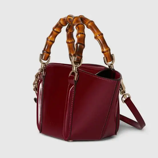 The Gucci Mini Bamboo Top Handle in Burgundy is a sophisticated and elegant bag that brings a deep, rich tone to any outfit. Its basket-inspired shape with a hexagonal base creates a refined and eye-catching silhouette.