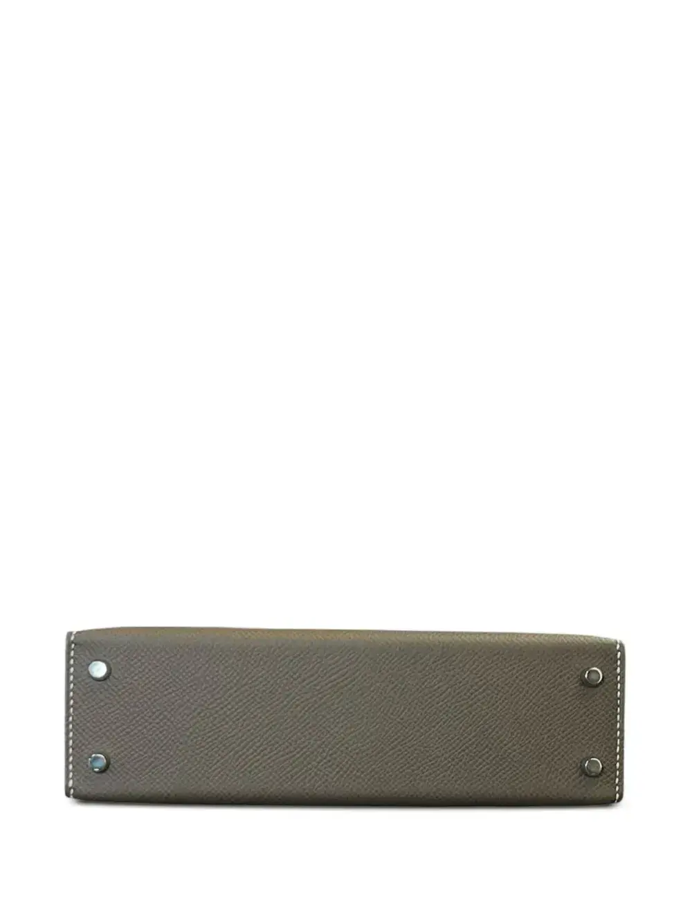 The handbag shown in the image is an Hermès Mini Kelly Sellier 20, crafted in the popular Etoupe color of durable Epsom leather, and featuring palladium (silver-tone) hardware.