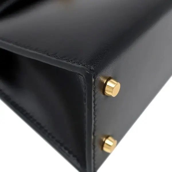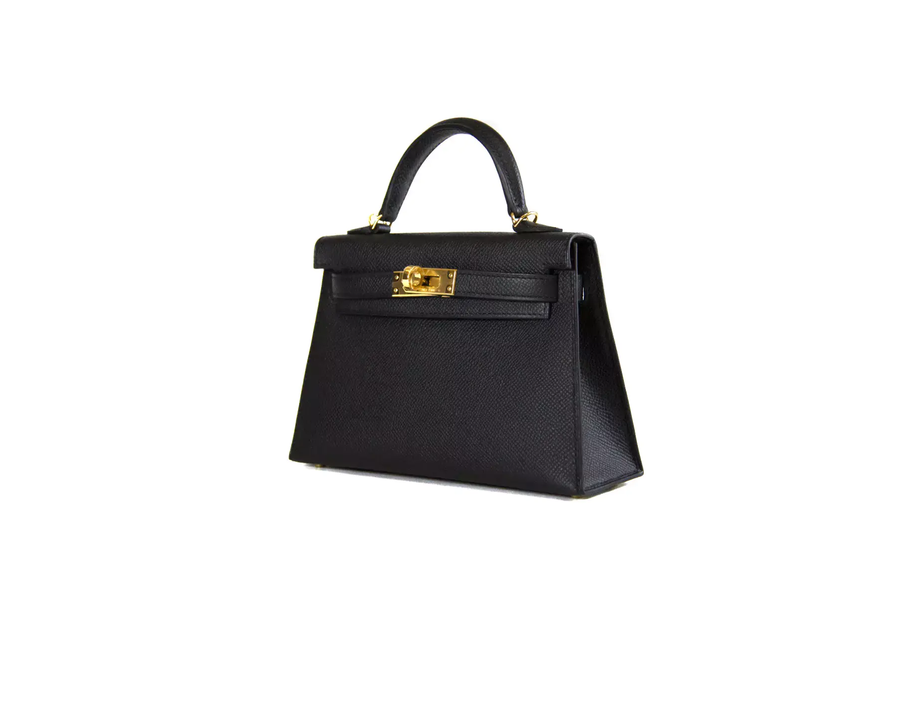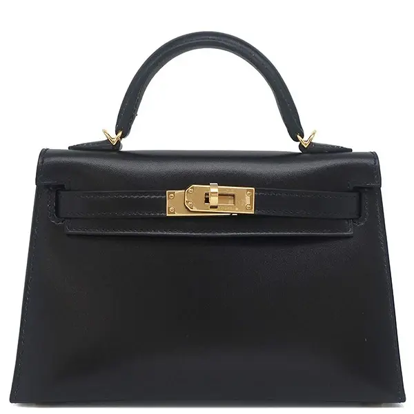 The handbag in the image is a Hermès Kelly Sellier 20 Mini in black box calf leather with gold hardware. This highly sought-after bag is known for its structured, sharp silhouette and classic appeal.