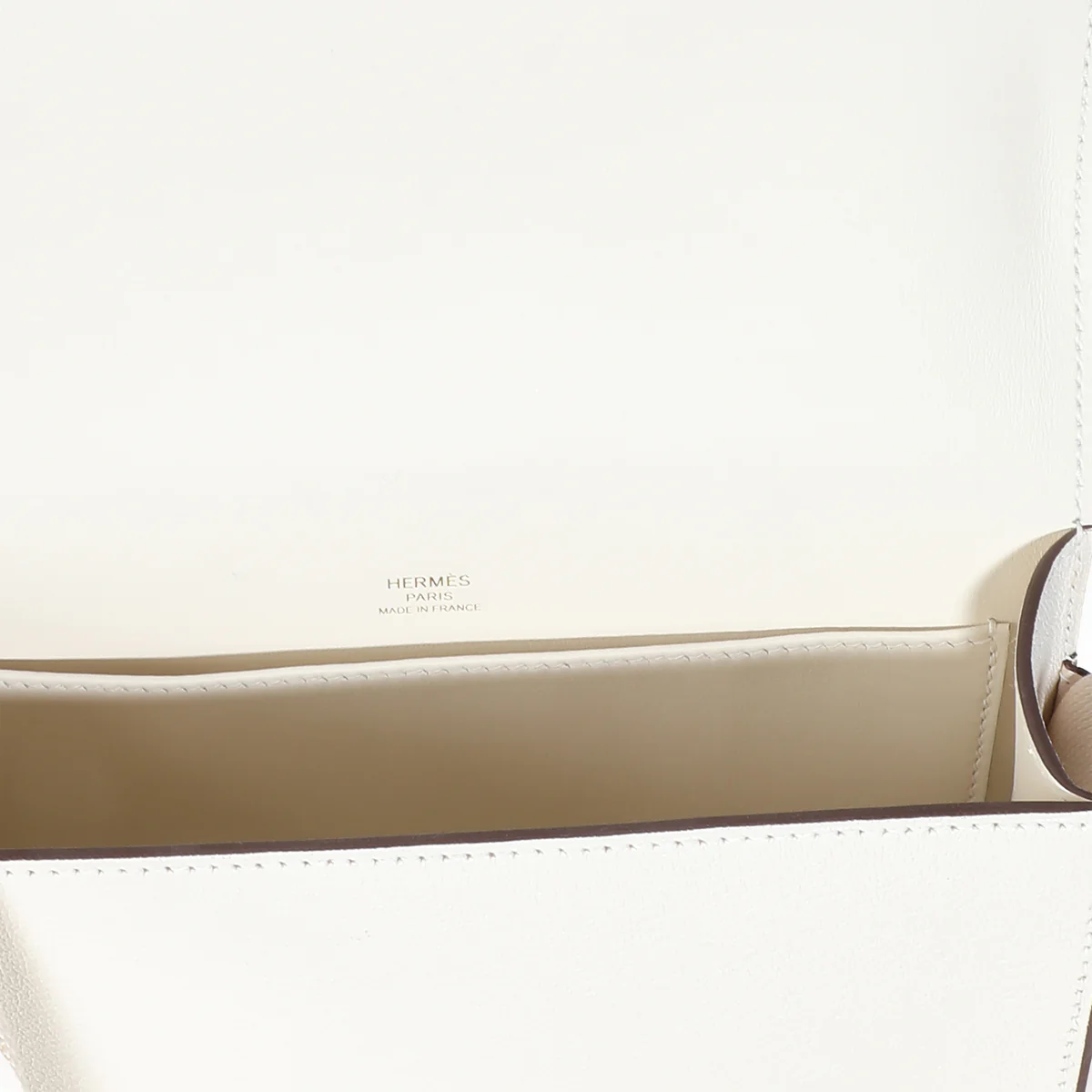 Elevate your style with this Hermès Mysore Chevre handbag in a sophisticated Mushroom/White color. Featuring a 20″ strap drop and gold-tone hardware, this piece exudes timeless elegance. The exterior shows only faint corner wear and minor scuffing, while the hardware has light scratches, keeping it in excellent 9.5/10 condition.