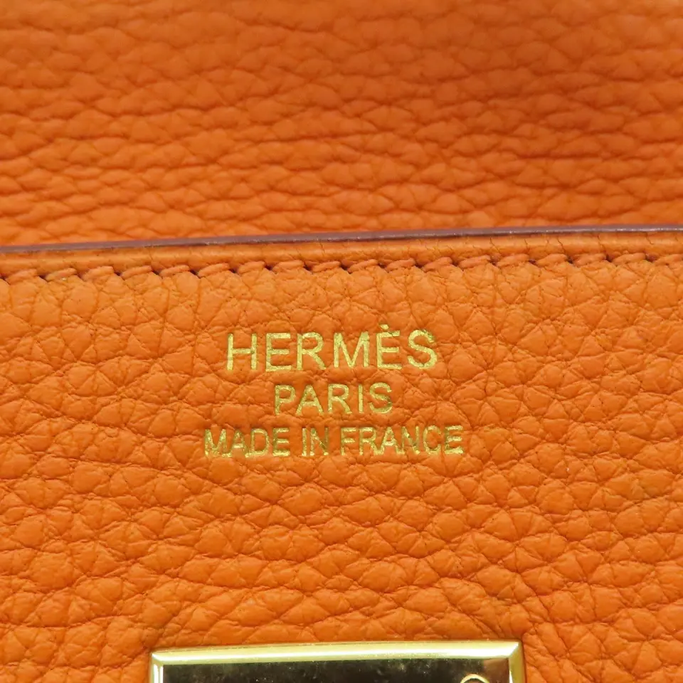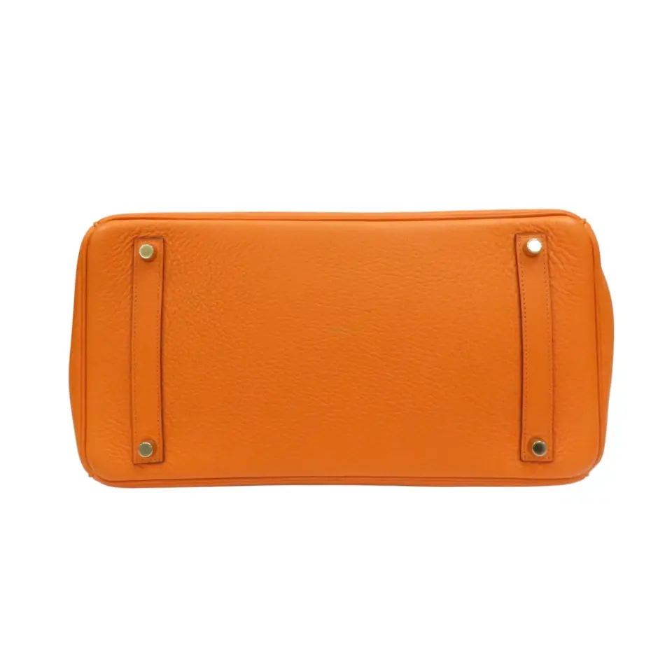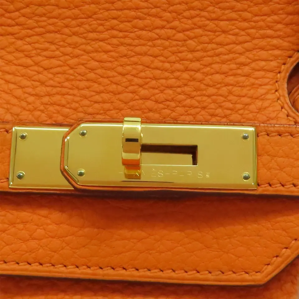Hermès Birkin bag in a vibrant orange color with gold hardware. The Birkin bag is a highly sought-after, iconic luxury handbag created by the French company Hermès in 1984