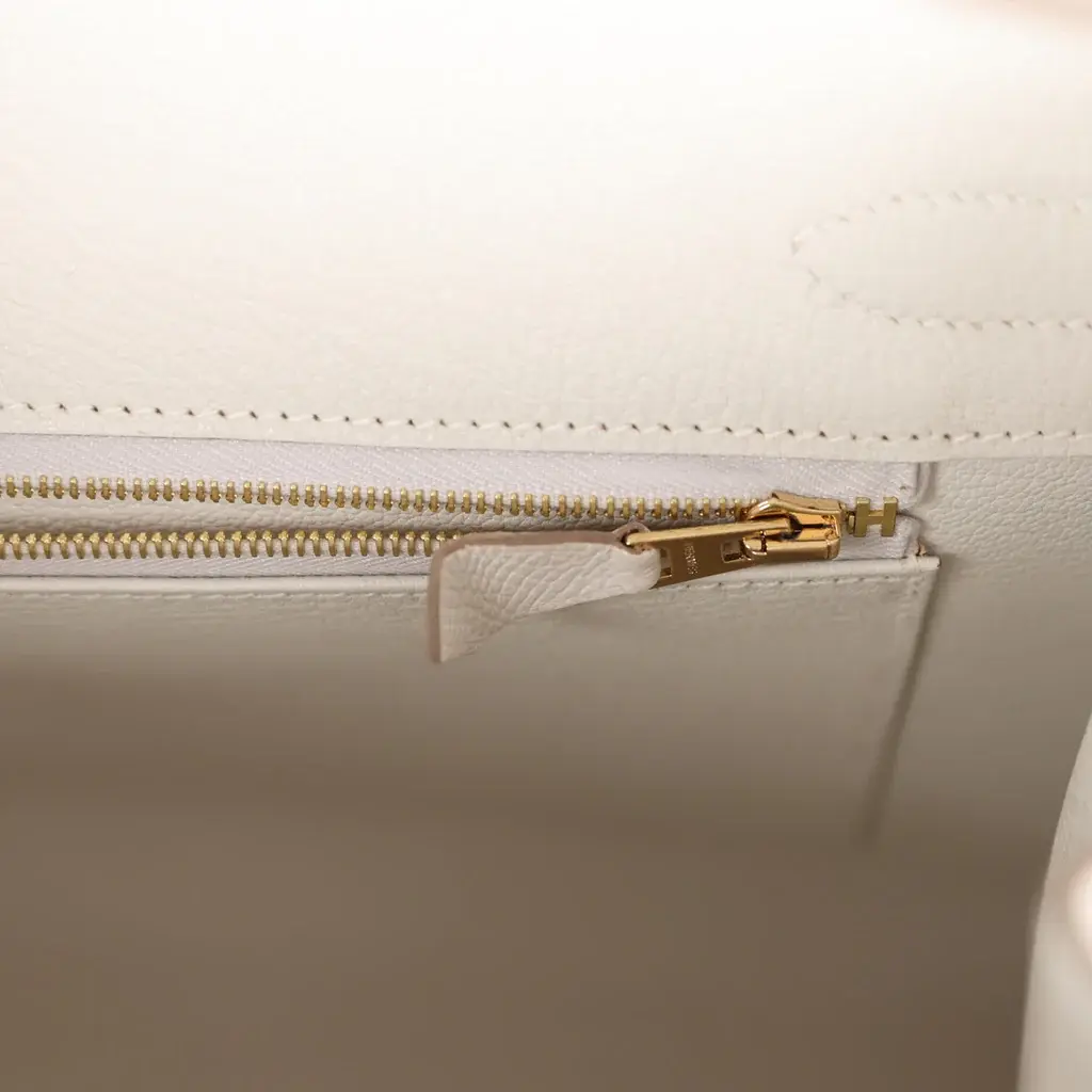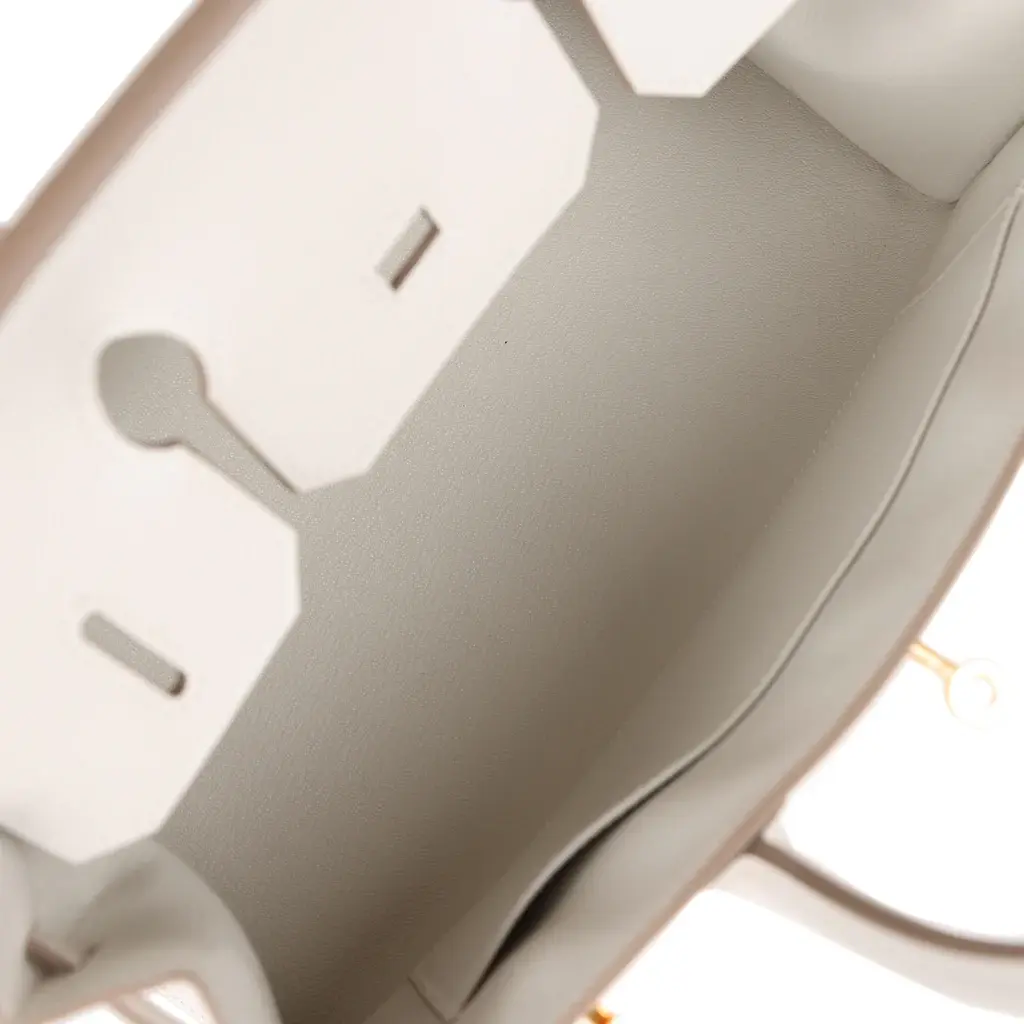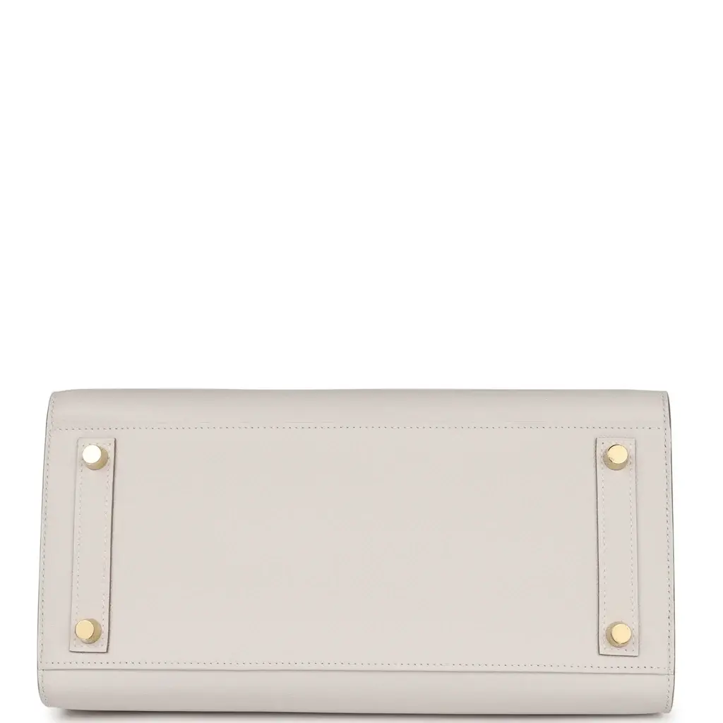 The handbag in the image is an Hermès Birkin Sellier 30 in the color Gris Pâle (a pale gray or off-white hue) with gold hardware. This specific style features the structured “sellier” construction with distinct, sharp edges and visible outer stitching.