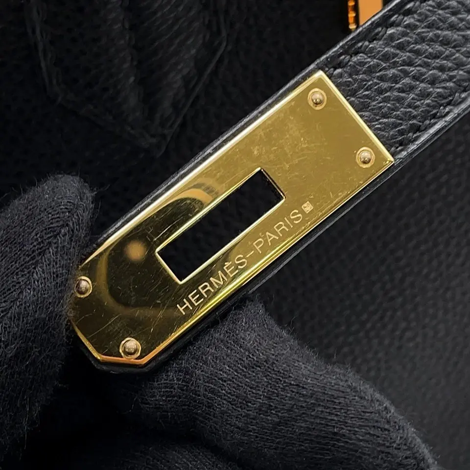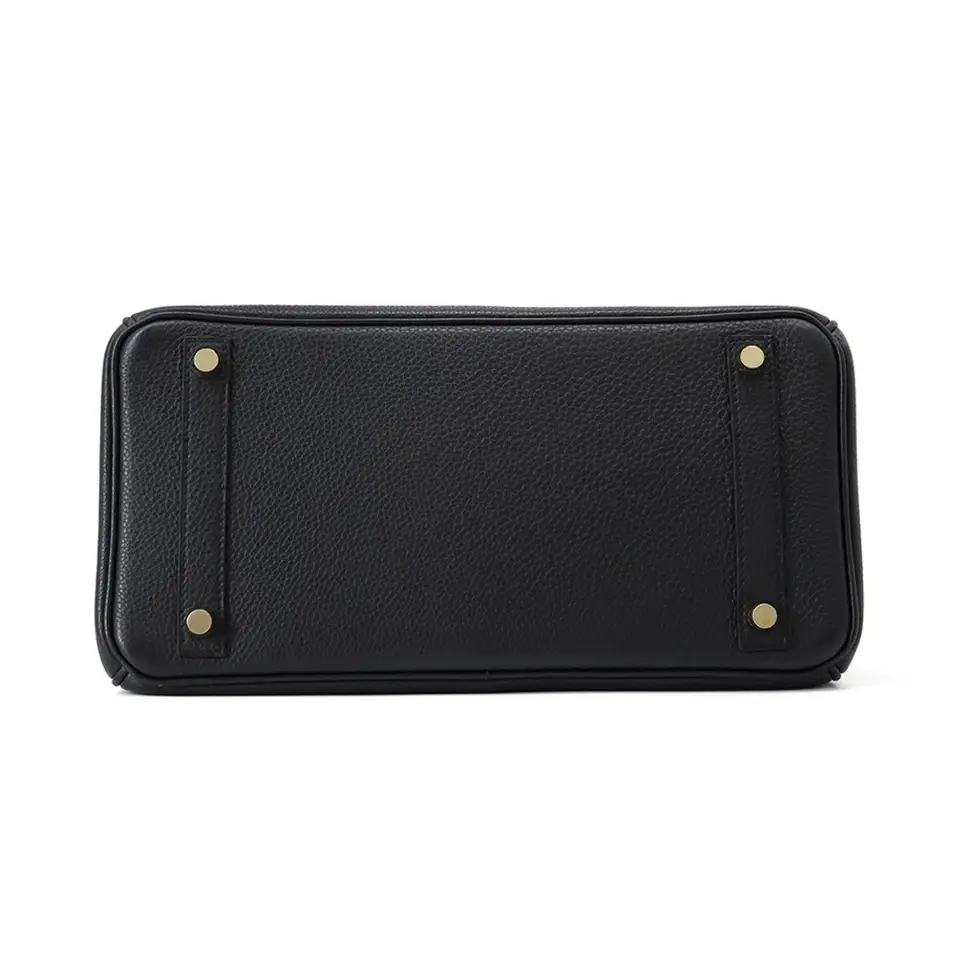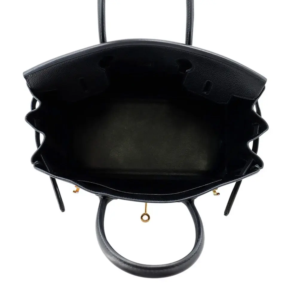 The handbag in the image is an Hermès Birkin 30 in black Togo leather with gold hardware. The Birkin bag is an iconic symbol of luxury, known for its meticulous craftsmanship and high demand.