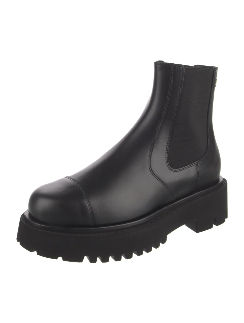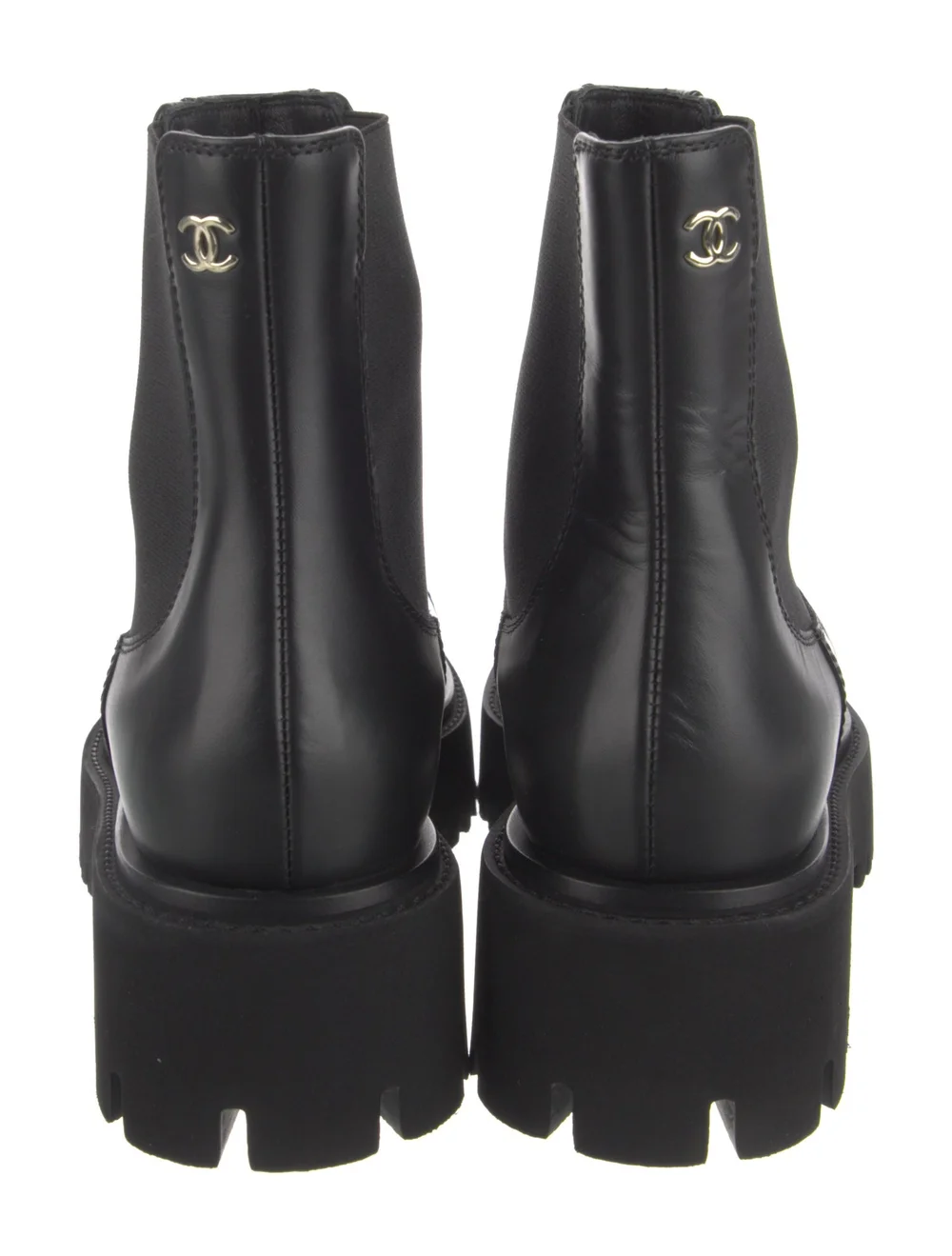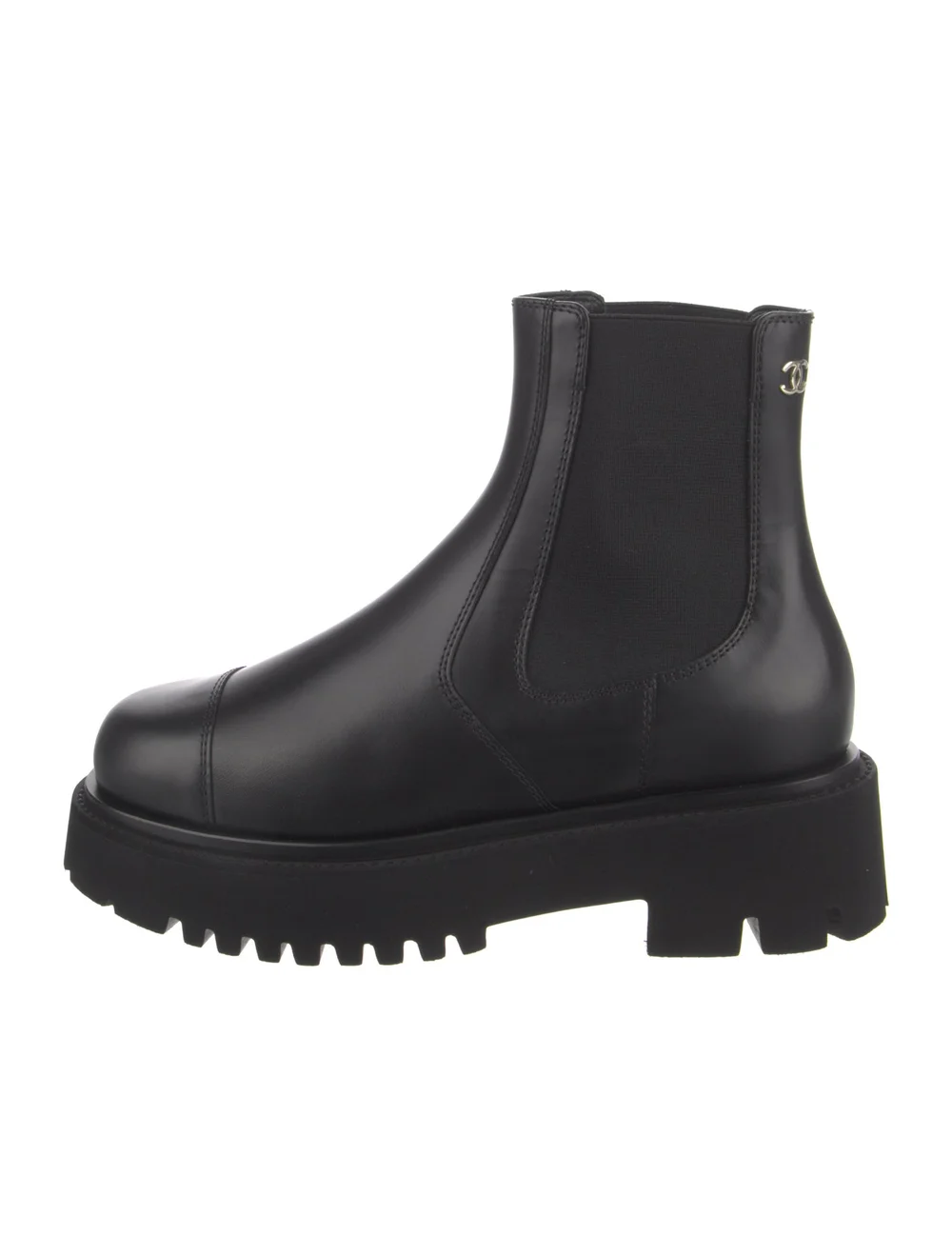 These are Chanel Interlocking CC Logo Chelsea Boots (also referred to as side-gore or combat boots) in black leather with gold-tone hardware. This specific style features a chunky lug sole and the iconic gold-tone CC logo emblem on the ankle. .