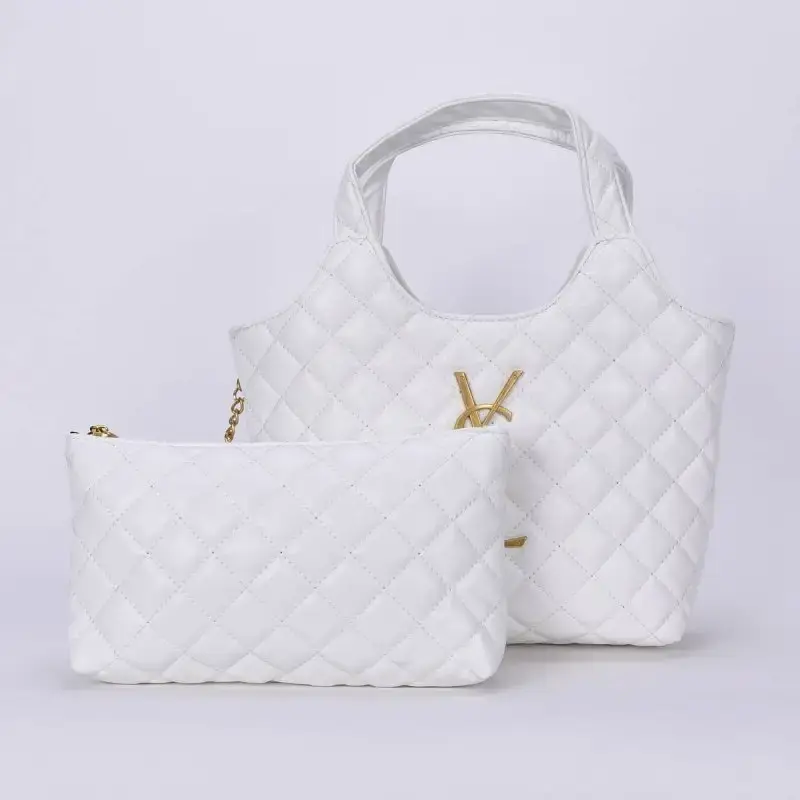 This stylish handbag set features a chic quilted design in a classic white color. The main tote offers a structured shape with comfortable top handles and a gold-tone logo accent for a touch of luxury. It comes with a matching zippered pouch, perfect for organizing small essentials. Ideal for everyday use or special occasions, this set combines elegance, practicality, and modern style