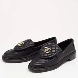 These are Chanel quilted leather loafers with a gold-tone interlocking CC logo on the vamp. They typically feature a round toe and a slightly stacked heel. This style is a classic design from the brand and has been released in various collections over the years, including recent ones like the Cruise 2024 collection.