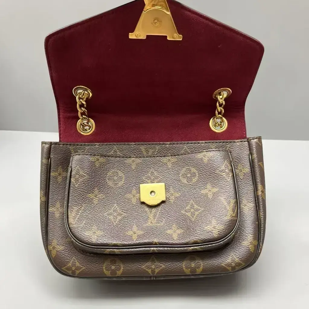 This Louis Vuitton Monogram Passy is in excellent condition and perfectly combines elegance with practical luxury. Made from classic brown monogram canvas, it features a brown leather shoulder strap with a chic gold-tone chain for a stylish touch. The front flap showcases a striking black and gold LV logo that doubles as a sleek metal closure, and the bag includes a rear patch pocket for added convenience.