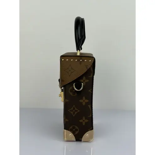 The handbag shown in the image is the Louis Vuitton Camera Box bag. It is crafted from a combination of the classic Monogram canvas and the Monogram Reverse canvas, featuring a compact, structured box shape that is inspired by the brand’s trunk-making heritage.