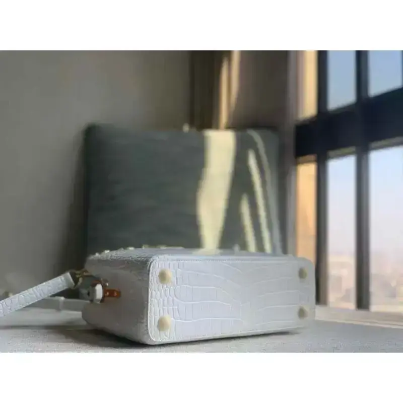 The handbag shown in the image is a Louis Vuitton Capucines Mini in white, likely crafted from brilliant alligator or crocodile leather. The bag features light-gold or gold-tone hardware, including the distinctive LV signature that can be displayed or tucked inside.