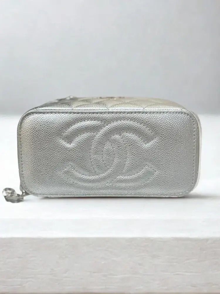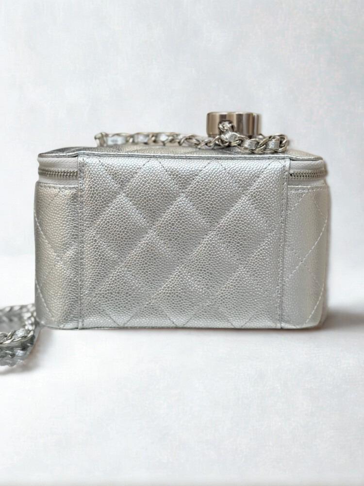 The Chanel Mini Vanity in Silver is a chic and modern piece that instantly elevates any outfit. Its structured box design with a top handle and signature chain adds a sophisticated touch, making it perfect for both everyday outings and evening events. The shimmering silver color catches the light beautifully, ensuring you stand out wherever you go.