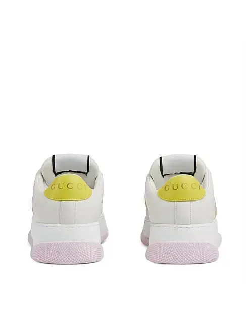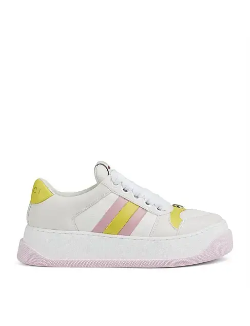 Step up your style with these iconic Gucci Ace Platform sneakers. Crafted from premium white leather, this design features the signature Gucci GG monogram panel and eye-catching pastel stripes in pink and yellow for a modern, playful touch. The elevated platform sole adds extra height while ensuring comfort and durability, making them perfect for everyday wear with a luxury edge
