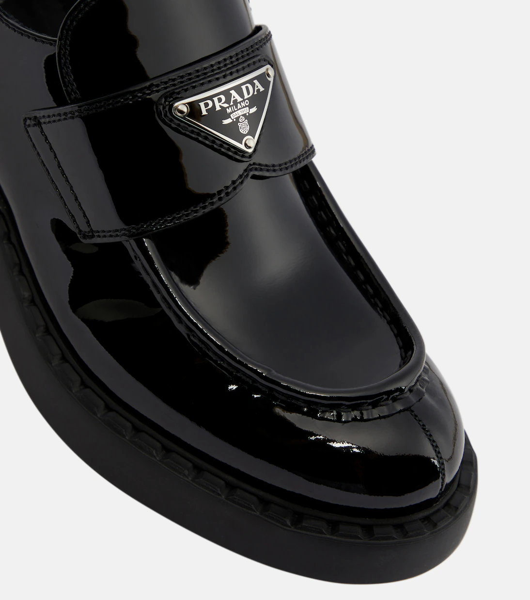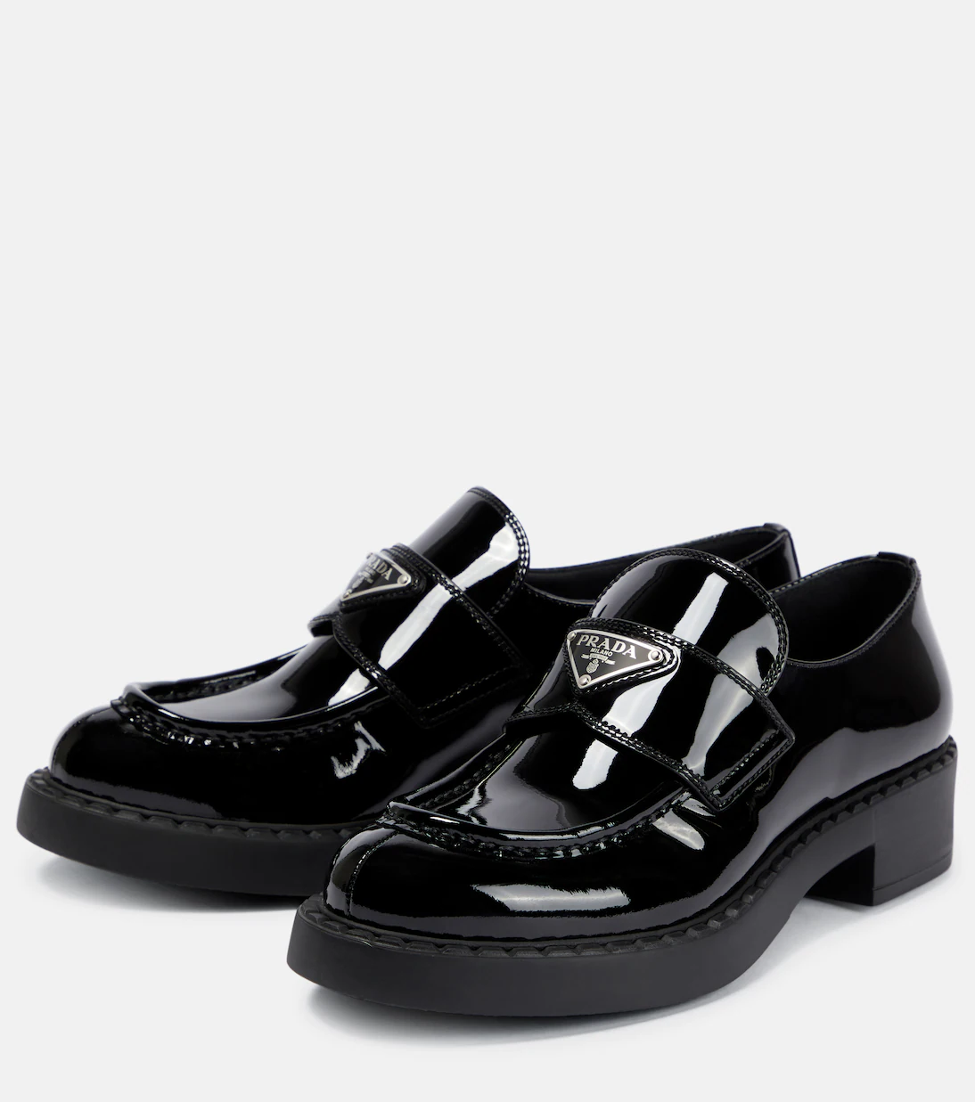 These are Prada Monolith patent leather loafers, known for their sleek design and chunky rubber soles. The style, officially called the “Monolith” or “Logo patent leather loafers,” is a contemporary take on a classic silhouette.