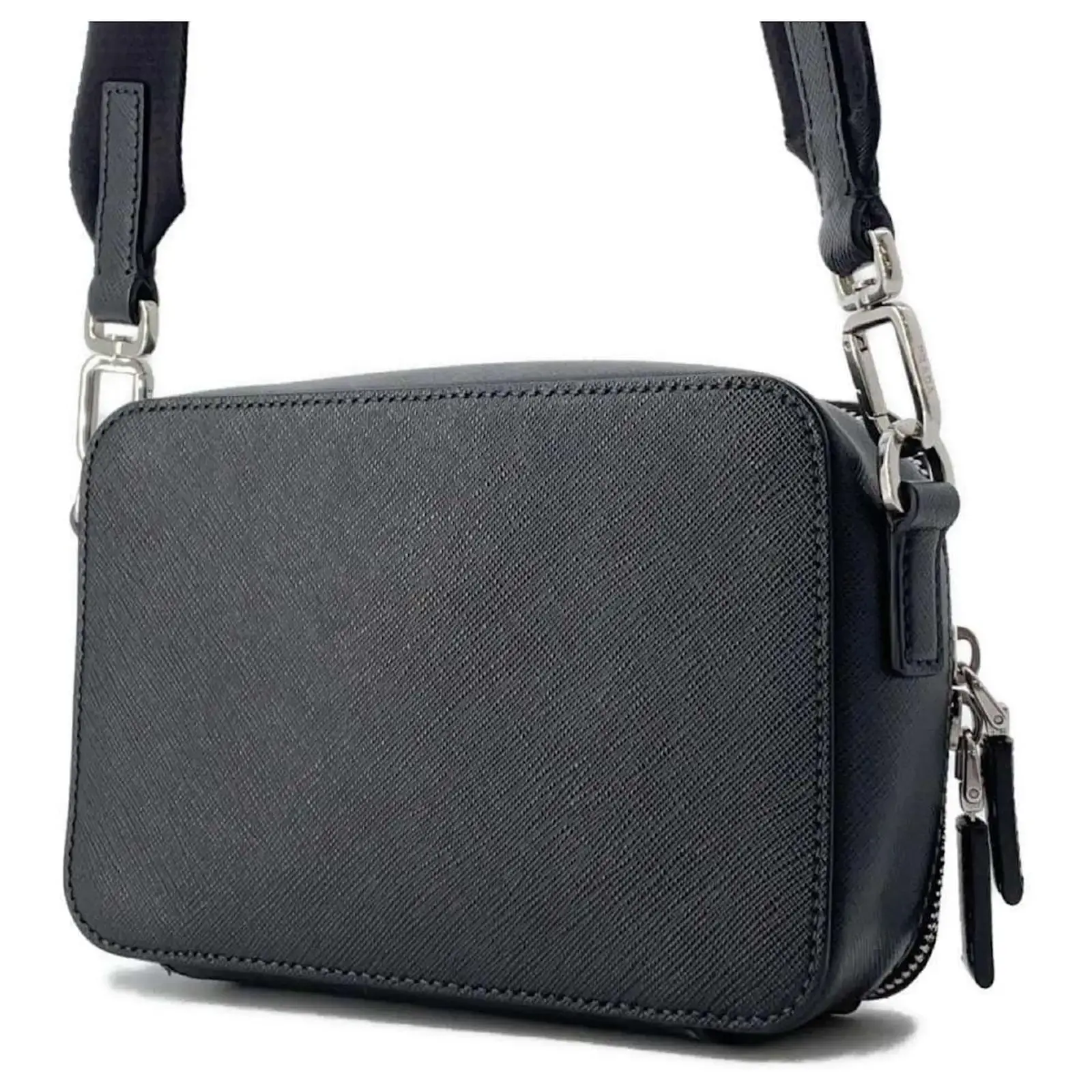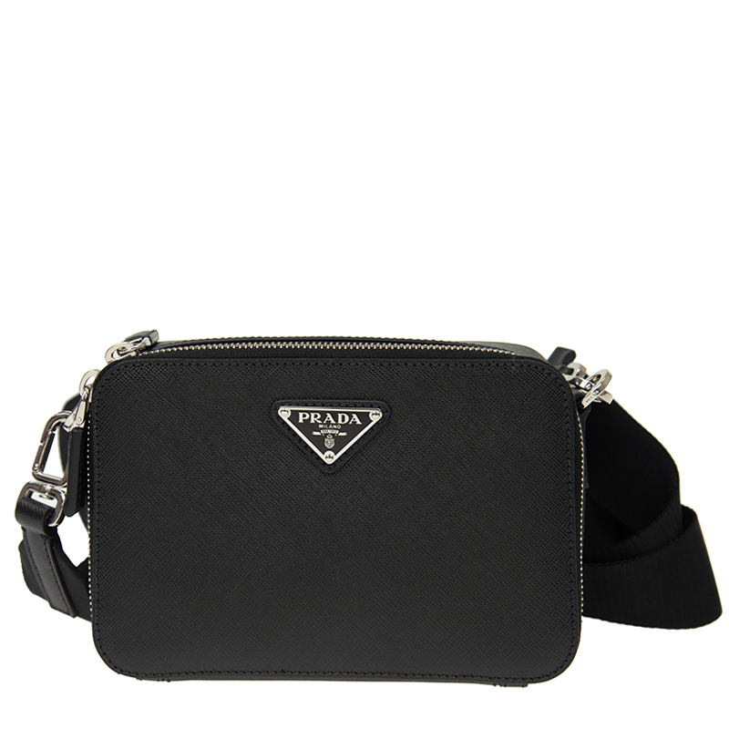 This Prada shoulder bag is crafted from Saffiano leather in a classic black color, featuring silver hardware. The dimensions of the bag are 12.5cm in height, 19cm in width, and 5.5cm in depth, making it a compact accessory suitable for various occasions.