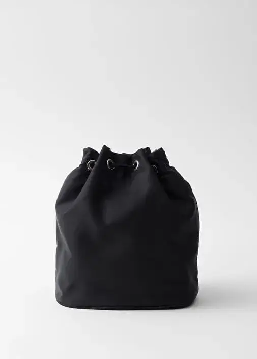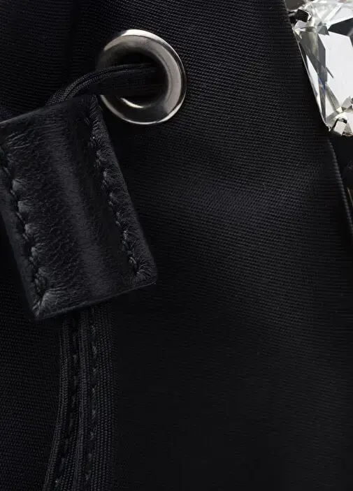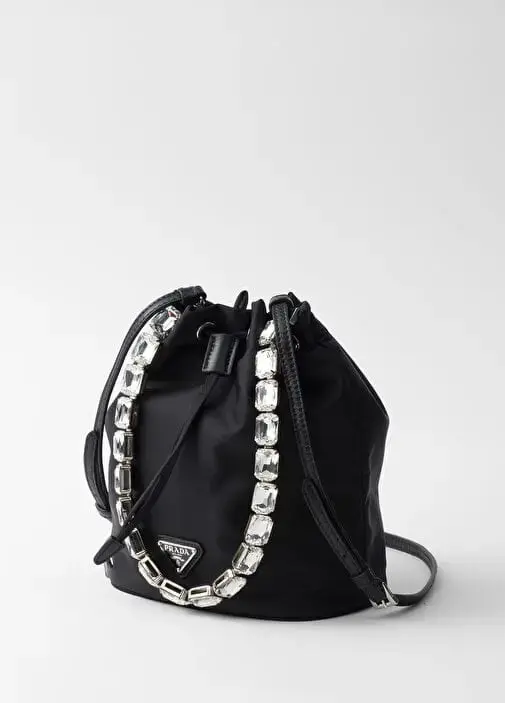 This mini-bag inspired by an archive design features a bucket bag silhouette and is made of Re-Nylon, the innovative regenerated nylon yarn that is an evolution of Prada’s iconic fabric. The refined accessory, which can be carried by hand or worn with the removable shoulder strap, is enriched with an elegant jeweled handle