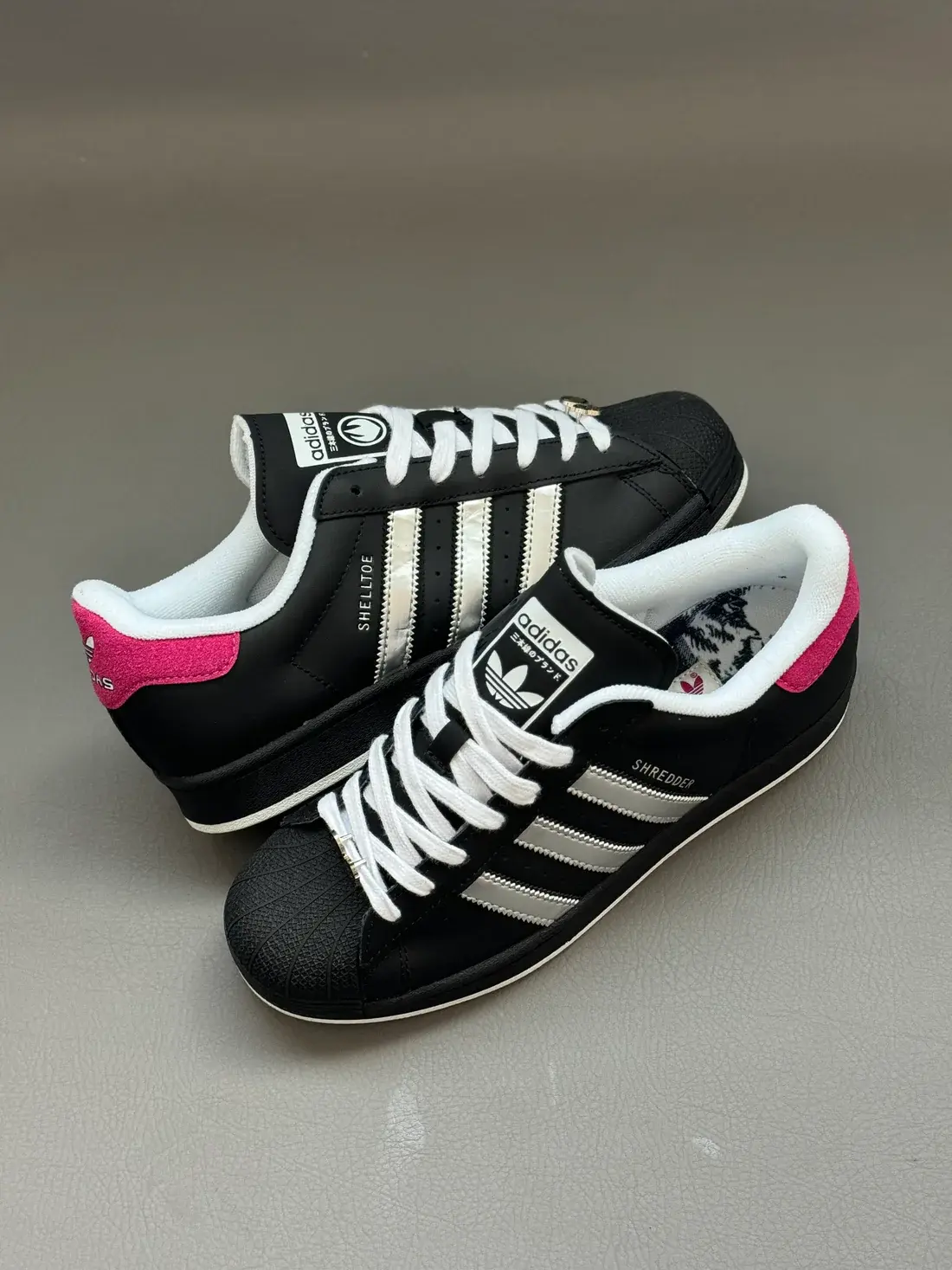 This exclusive release celebrates the legendary TMNT villain with a sleek black leather upper, metallic silver 3-Stripes, and bold details inspired by Shredder’s armor. The Japanese-written adidas slogan nods to his origins, while “Shredder” replaces the classic “Superstar” marking for a collectible finish.