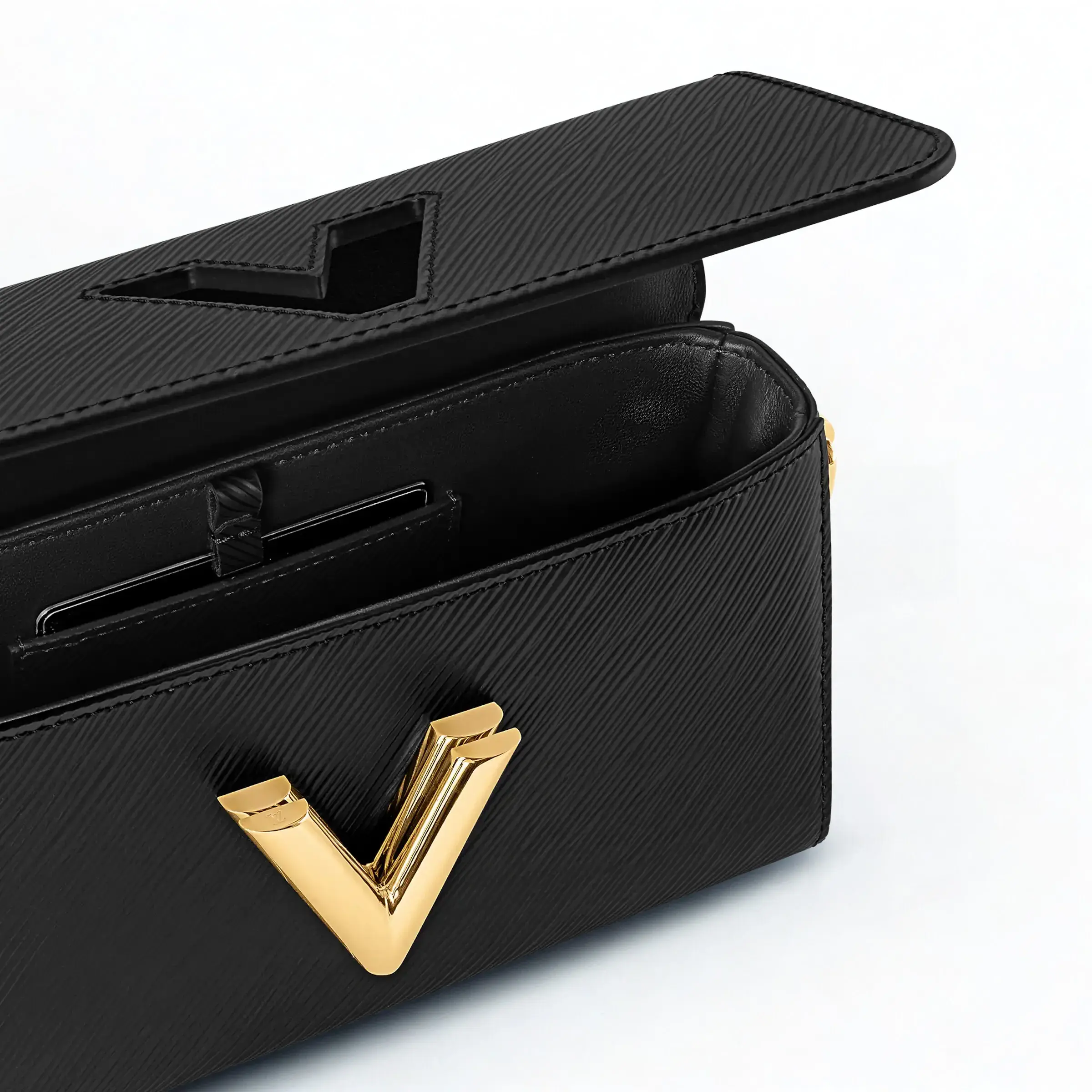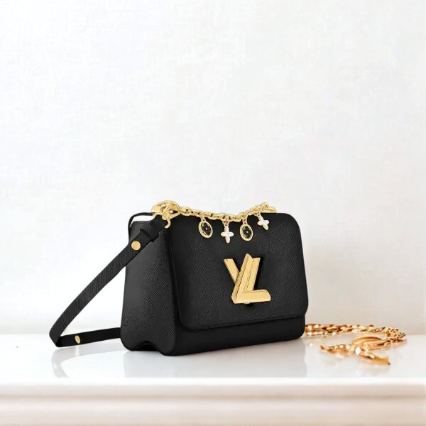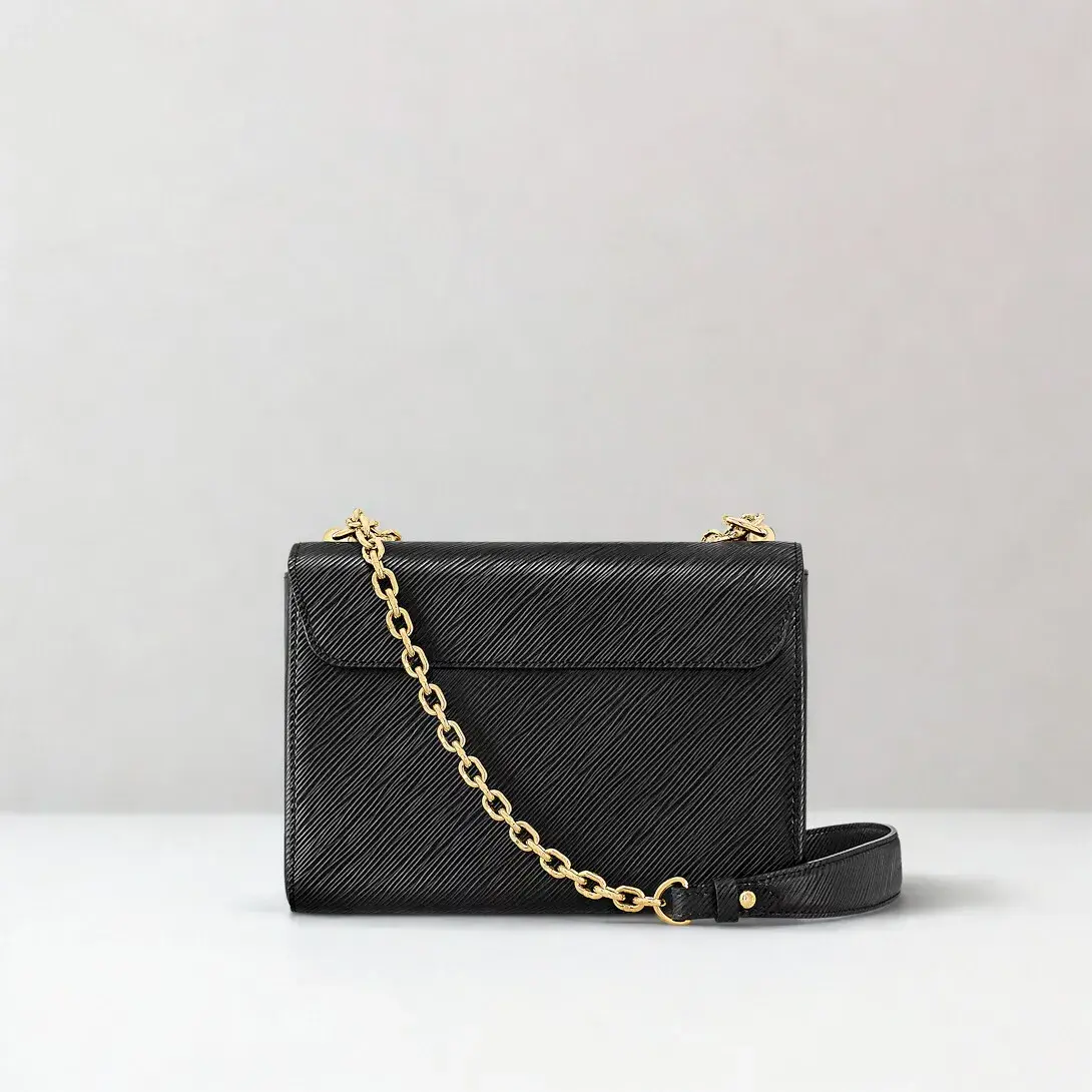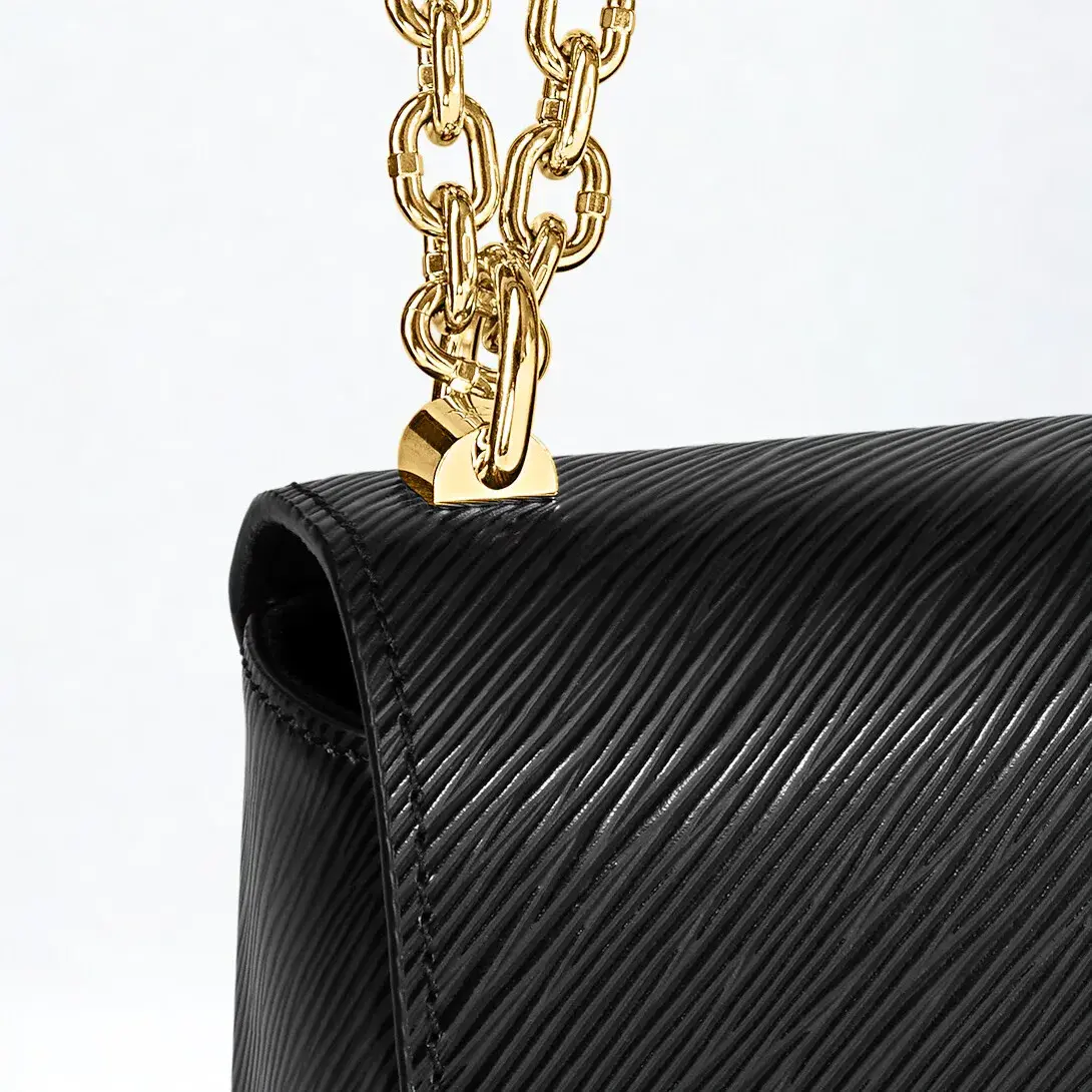 The Louis Vuitton Twist MM is crafted from iconic Epi grained leather with smooth cowhide trim and a luxurious leather lining. Designed with a refined chain strap and the signature LV Twist lock, it features a removable and adjustable strap, allowing it to be worn on the shoulder or crossbody. Finished with gold-tone hardware in a timeless Black Noir shade.