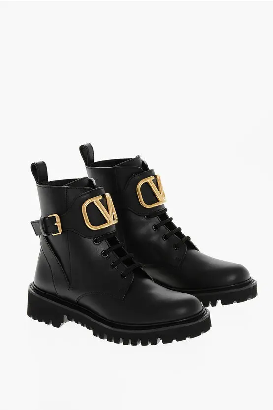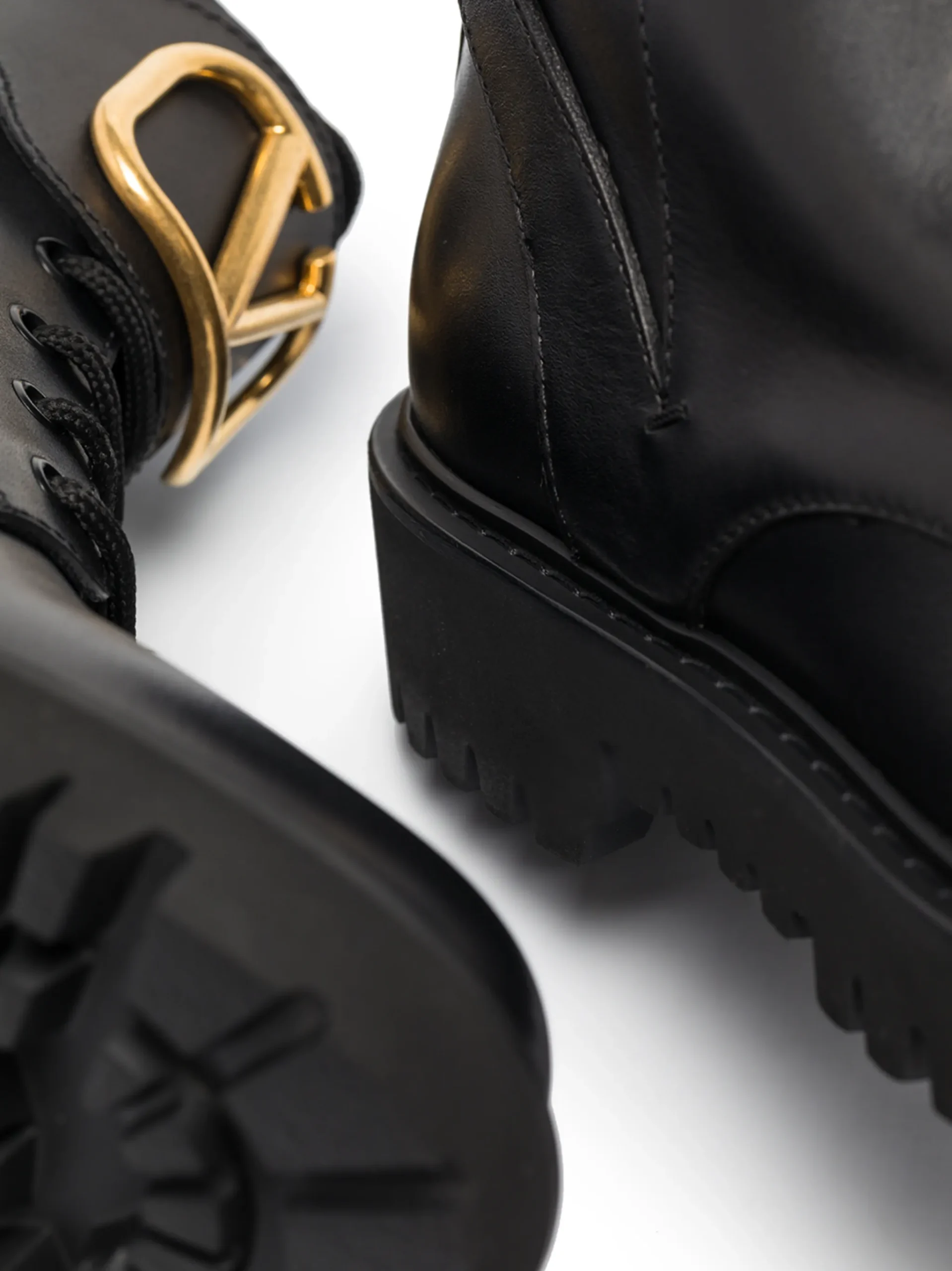 These are the Valentino Garavani VLogo Signature calfskin combat boots. They are identifiable by the black leather finish, classic lace-up design, and prominent gold-tone “VLogo” signature hardware on the ankle strap.