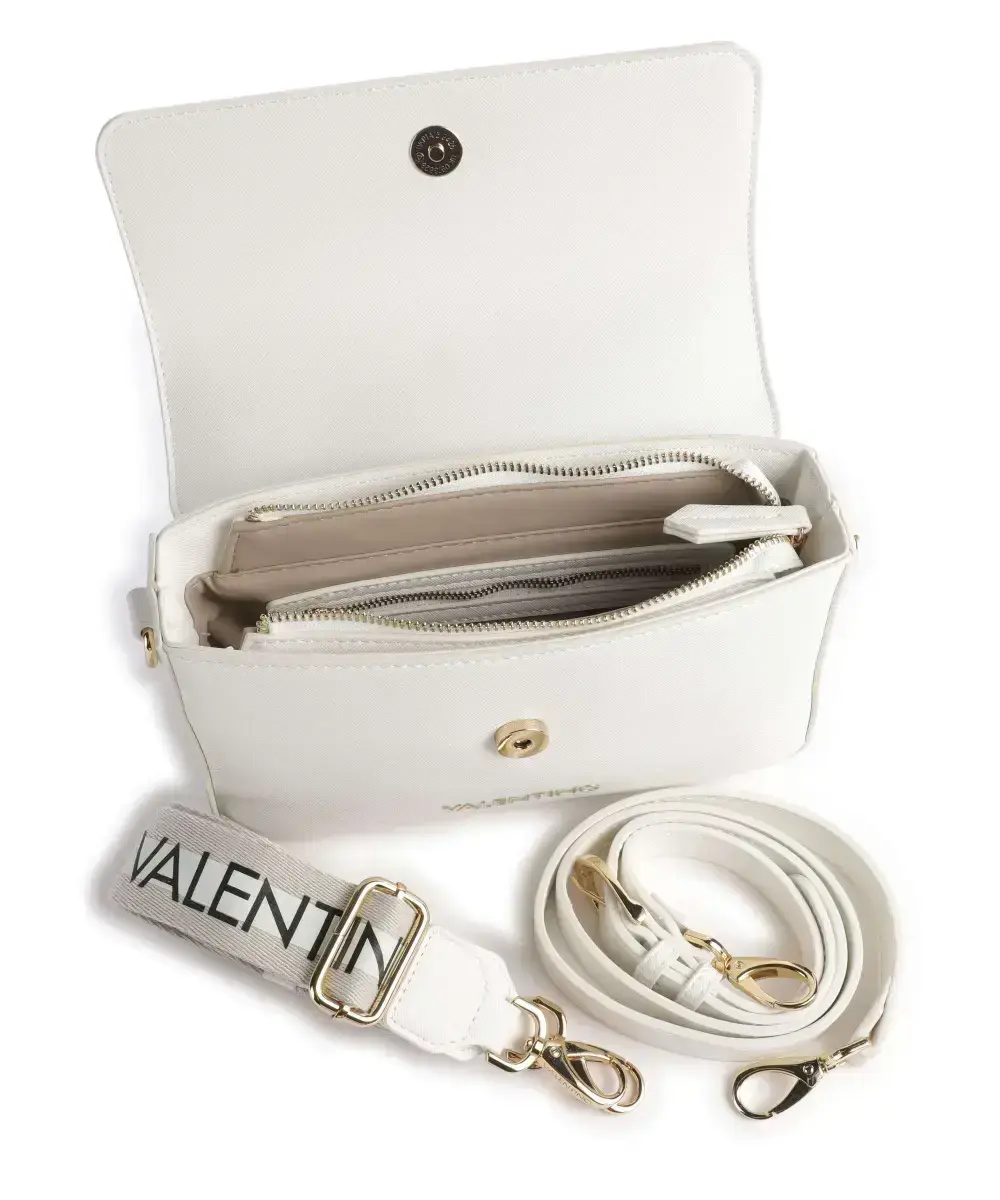 The Valentino Alexia in White adds a touch of sophisticated elegance to any outfit. Crafted from high-quality pebbled synthetic leather, it features a magnetic closure and a main compartment with an interior zip pocket to keep essentials organized. Comes with a detachable crossbody strap and a short handle for versatile carrying. Perfect for both everyday use and evening outings