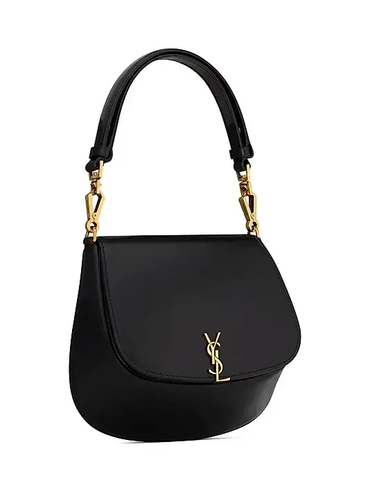 The front flap is adorned with the iconic YSL gold-tone logo, adding a sophisticated statement detail. It includes an adjustable and detachable leather shoulder strap for versatile styling options.